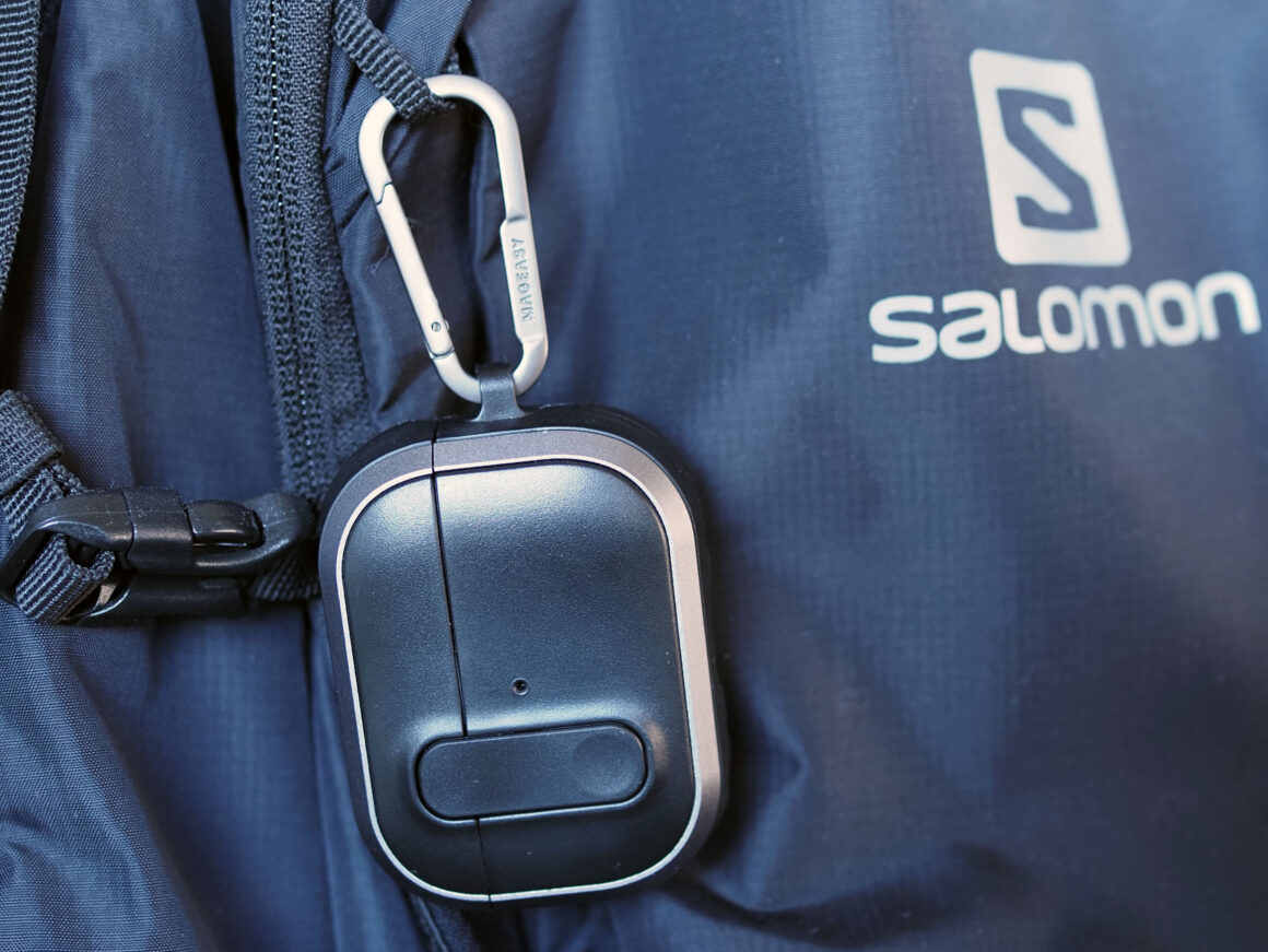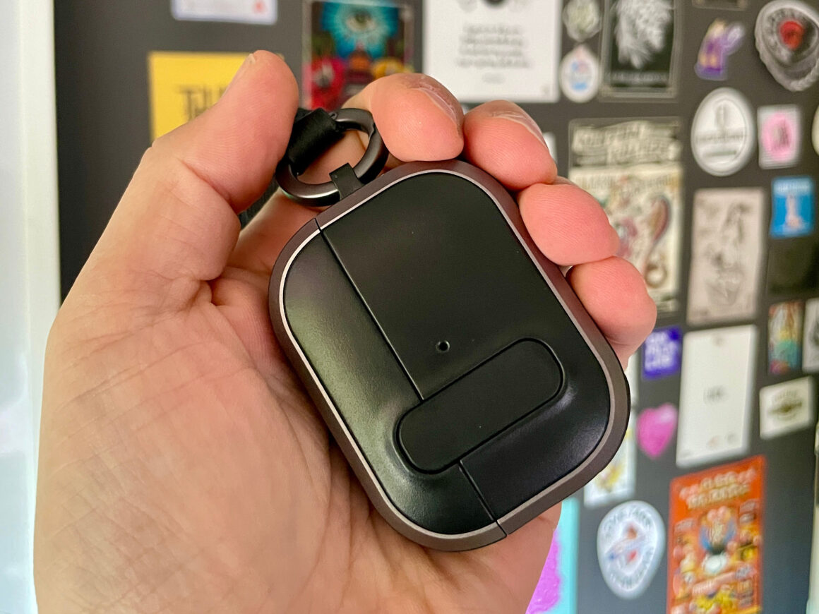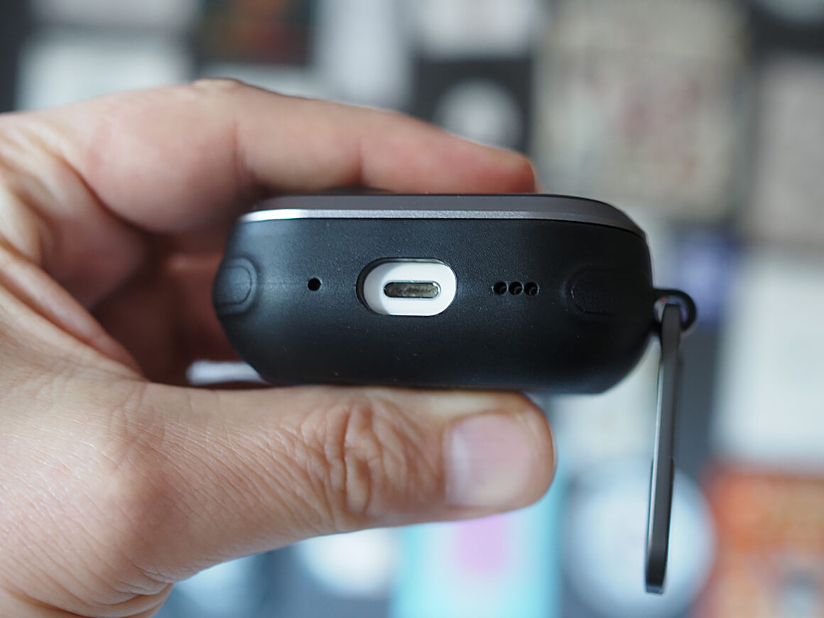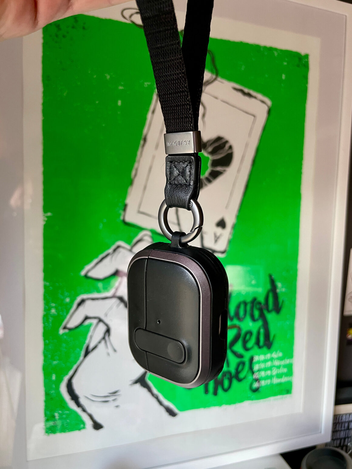 Das Odyssey wirkt auf Anhieb extrem stabil. Aluminium, saubere Verarbeitung, ordentliche Haptik – das Ding liegt richtig satt in der Hand. Allerdings bedeutet das auch: Das Case trägt ordentlich auf. In die enge Hosentasche würde ich es nicht mehr stecken, dafür gibt’s aber gleich zwei Alternativen im Lieferumfang: einen Karabinerhaken und ein Wrist Strap. Damit baumeln die AirPods wahlweise am Rucksack, an der Jacke oder am Handgelenk – sehr praktisch im Alltag.